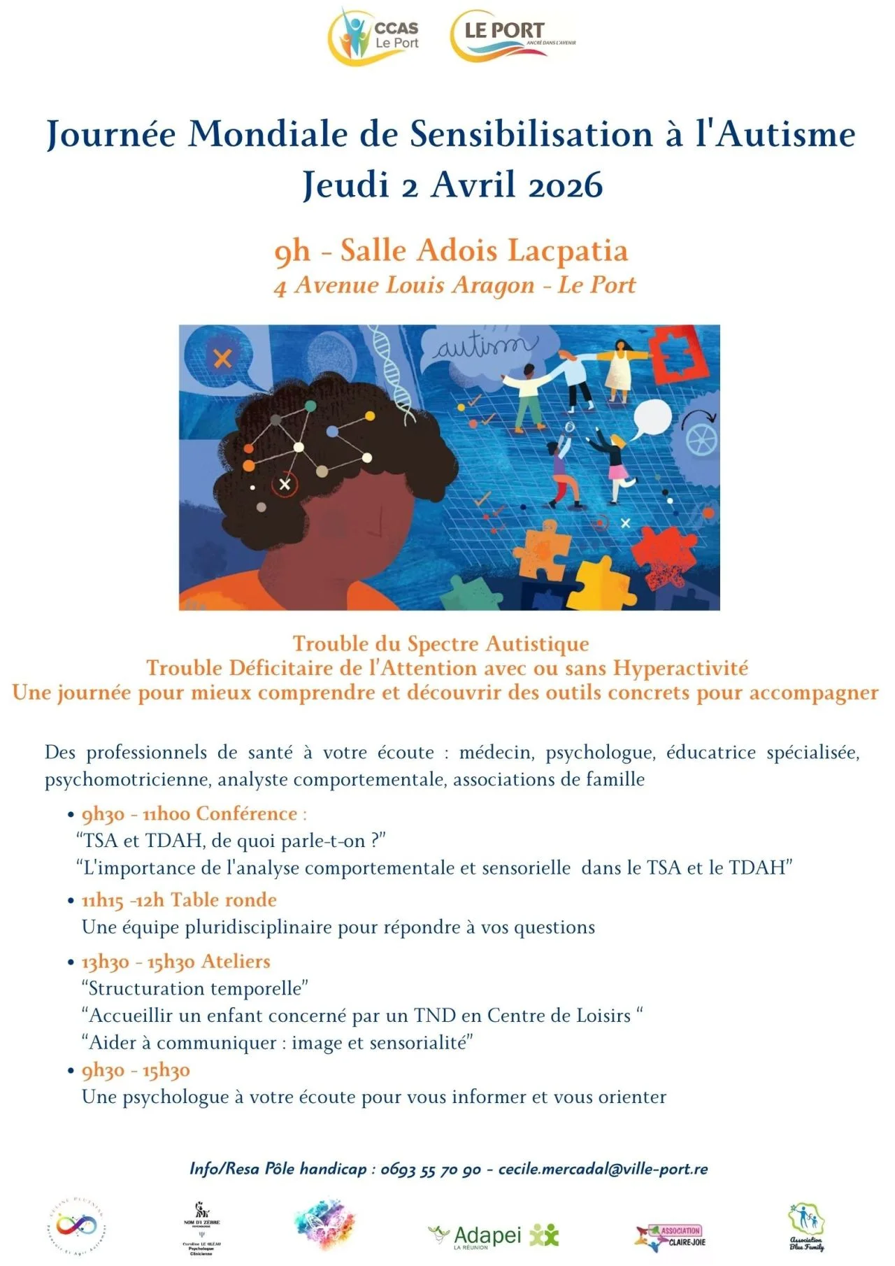 La Commune du Port et le Pôle Handicap du CCAS du Port ont le plaisir de vous inviter à leur événement organisé à l’occasion de la Journée mondiale de sensibilisation à l’autisme, qui se tiendra le jeudi 2 avril à 9h, à la salle Adois Lacpatia, située au 4 avenue Louis Aragon au Port.