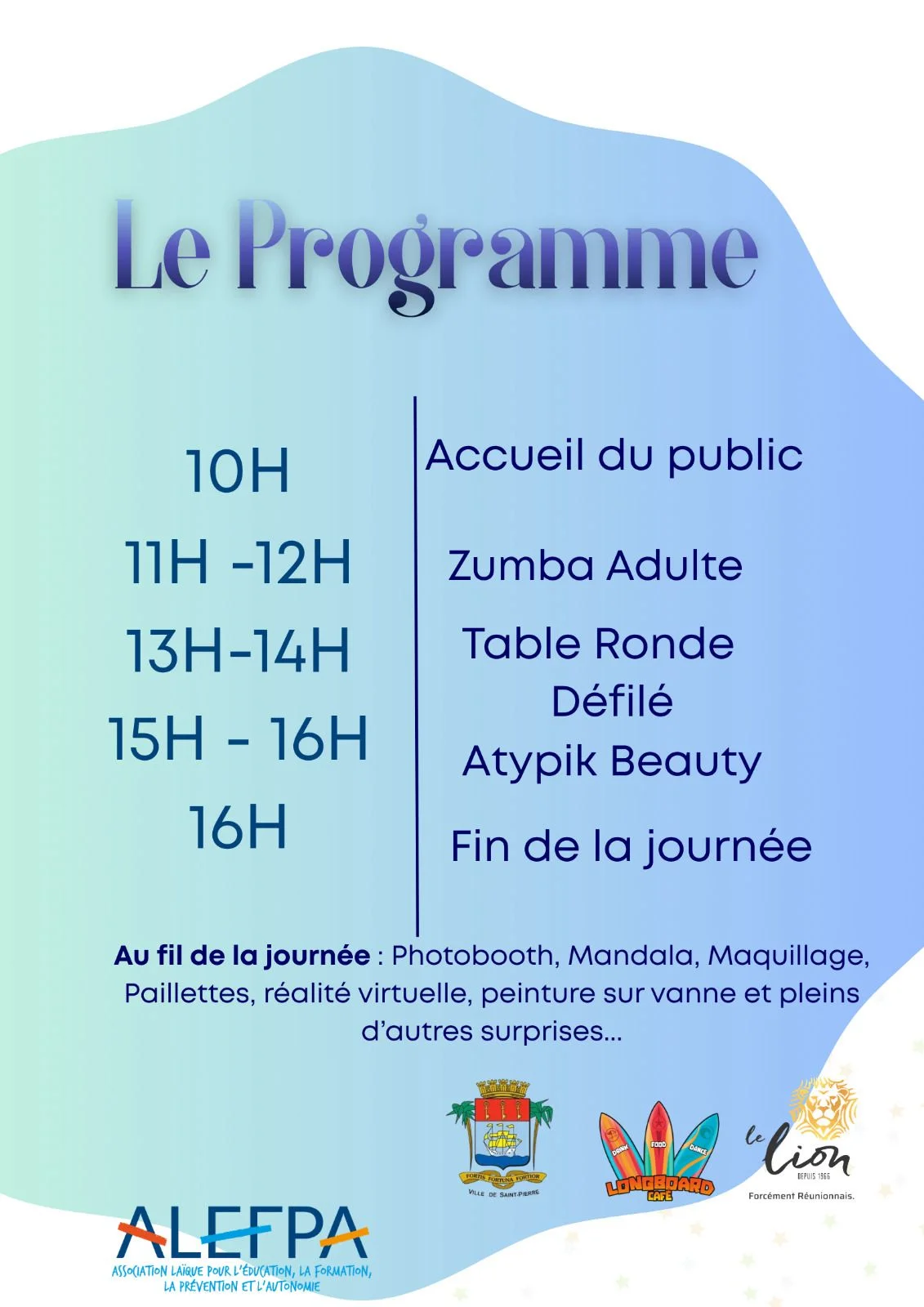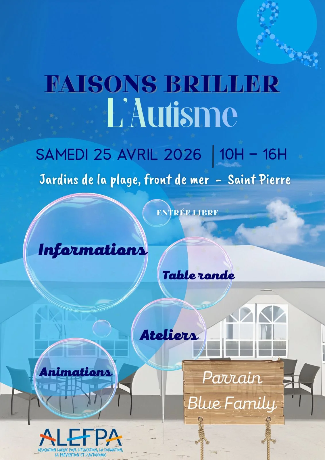 L’ALEFPA organise, le samedi 25 avril 2026, de 10h00 à 16h00, une journée dédiée à la sensibilisation à l’autisme aux Jardins de la plage, à Saint‑Pierre