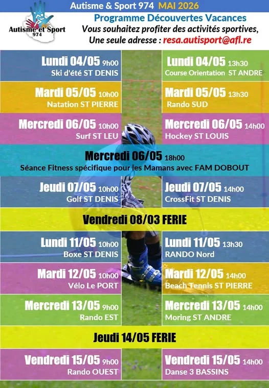 Le programme d'Autisme et Sport 974 pour le mois de mai.