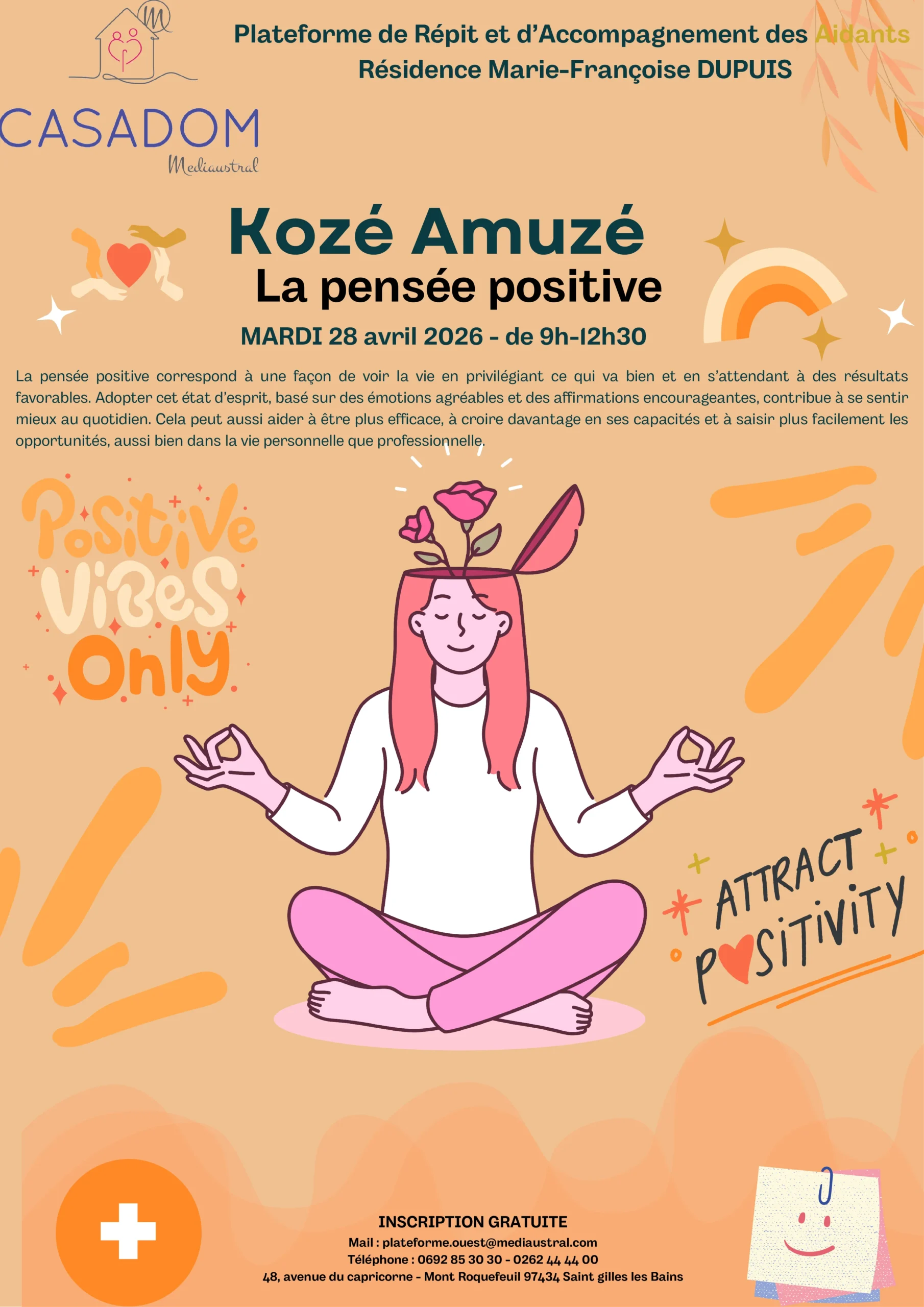 Participer à un moment d’échange autour du thème “La pensée positive”, le mardi 28 avril 2026, de 9h à 12h30.