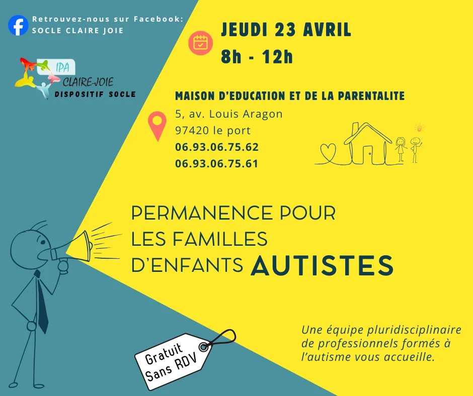 Participez à la permanence pour les familles d'enfants autistes le jeudi 23 avril 2026 au Maison d'éducation et de la parentalité, 5 av. Louis Aragon, 97420 Le Port.