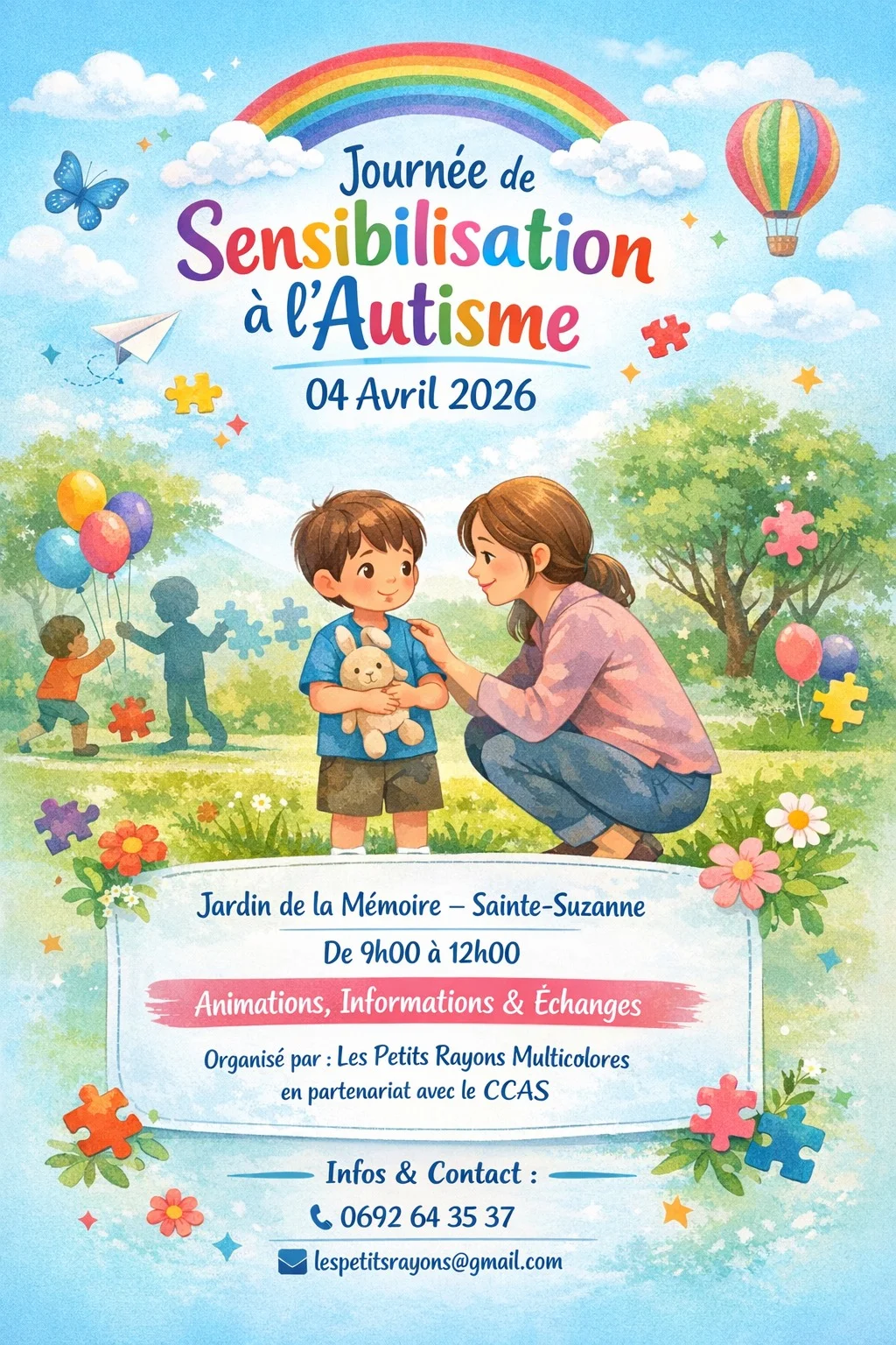 La mairie vous invite à participer à une matinée organisée par l’association Les Petits Rayons Multicolores, en partenariat avec le CCAS, le samedi 04 avril 2026, de 9h00 à 12h00, au Jardin de la Mémoire à Sainte-Suzanne.